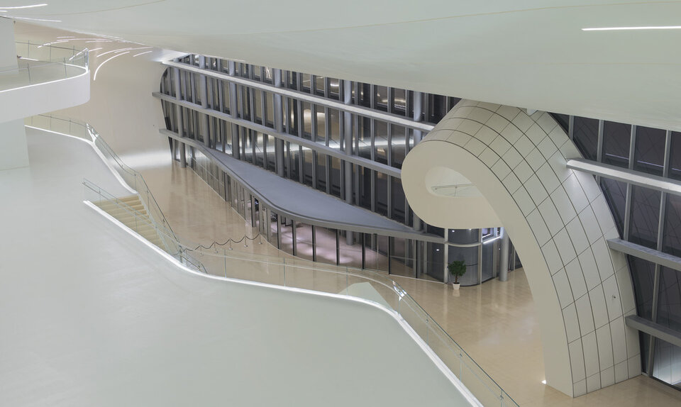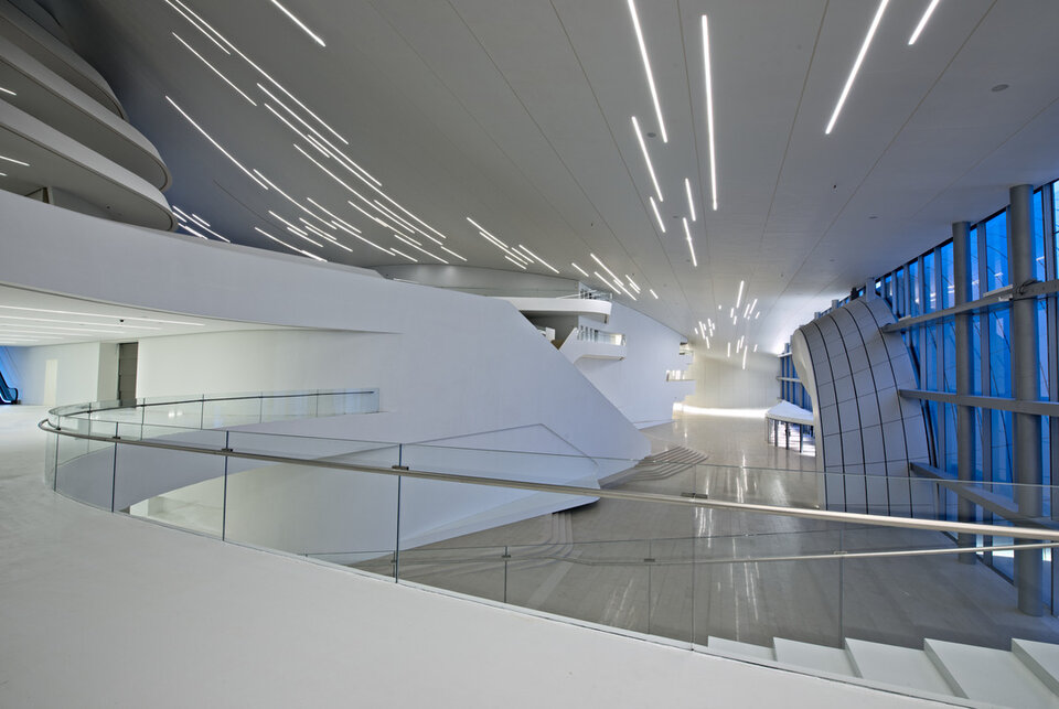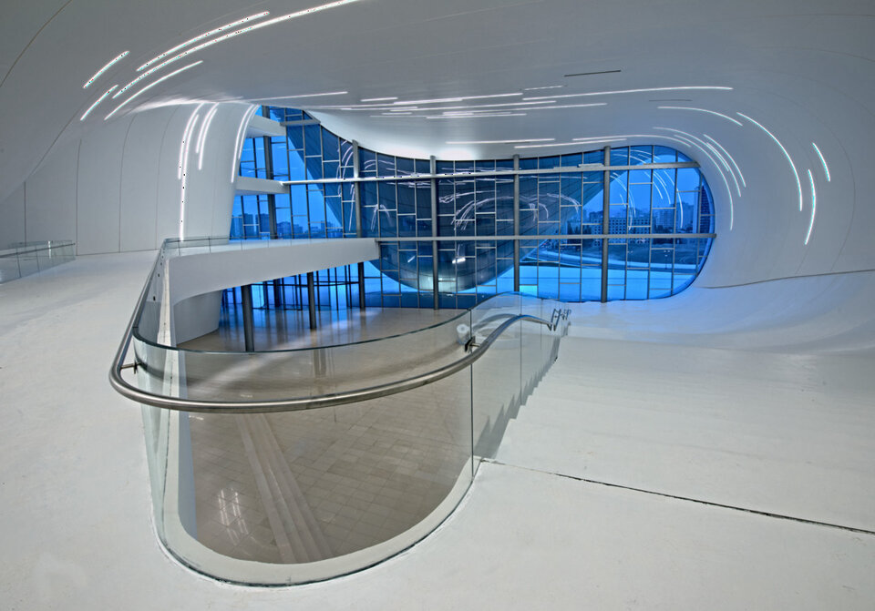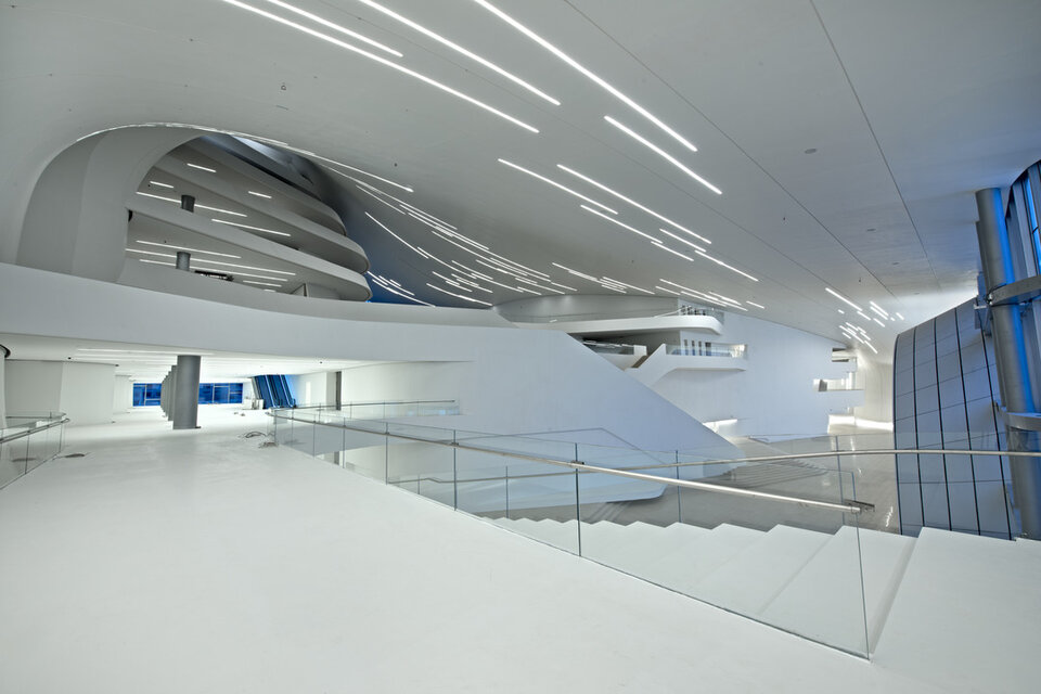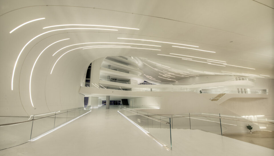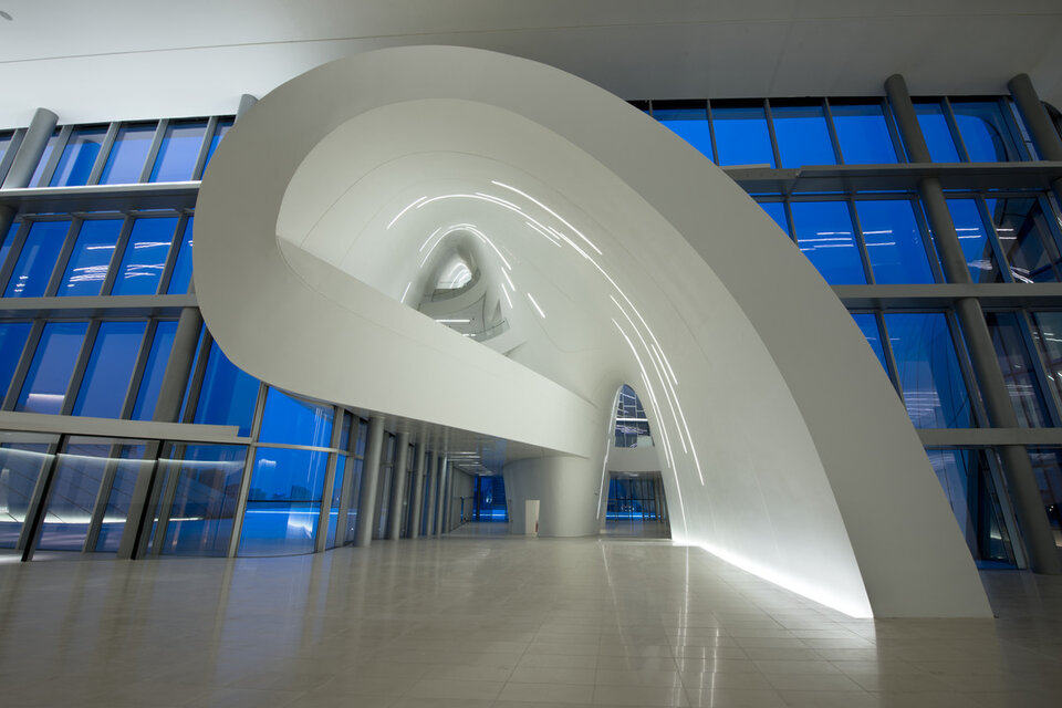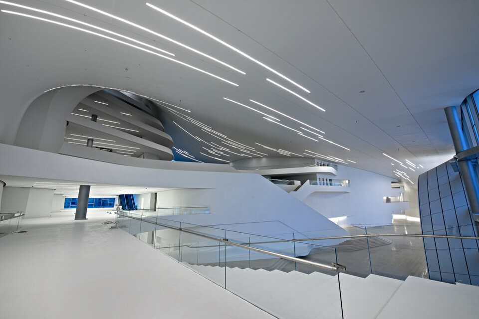 Das Heydar Aliyev Cultural Center, benannt nach dem früheren Präsidenten der Republik Aserbaidschan, überzeugt durch seine spektakuläre Architektur aus überwiegend fließenden Strukturen. Das 57,000 Quadratmeter große und bis zu 74 Meter hohe Kulturzentrum beherbergt eine Veranstaltungshalle, ein Museum und eine Bücherei. Lindner erhielt den Auftrag zur Montage einer anpassungsfähigen Unterkonstruktion im Foyer sowie der Verkleidung der geschwungenen Decken und Wände mit Gipsfaserplatten.