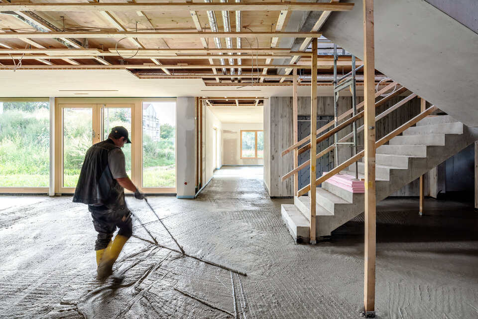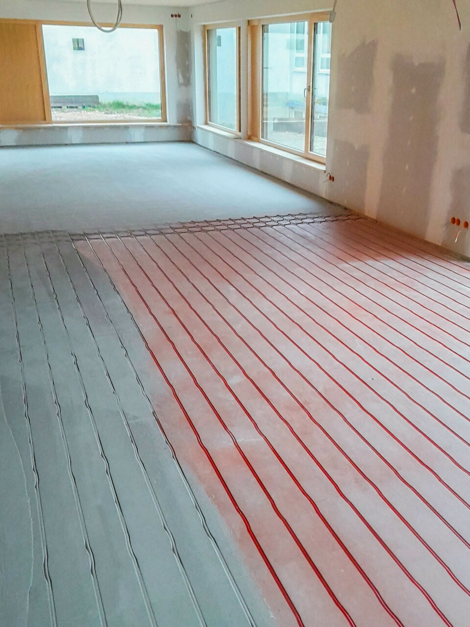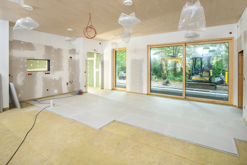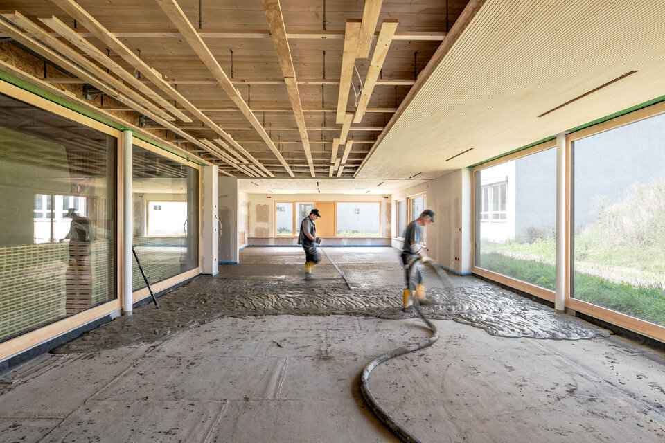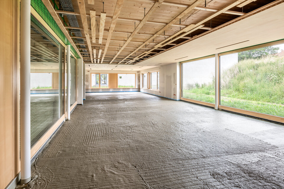 Die Lindner GFT leistete einen entscheidenden Beitrag zur Erfüllung der energetischen und funktionalen Anforderungen im Bereich Bodenaufbau und Flächenheizung. Im Rahmen der Ausbauarbeiten wurde zunächst eine gebundene Schüttung eingebracht, die eine plane, wärmedämmende Fläche mit hoher Druckfestigkeit, Nichtbrennbarkeit und hervorragender Pumpfähigkeit schafft. Diese Lösung ermöglicht einen präzisen Höhenausgleich und bildet das ideale Fundament für die weitere Installation.