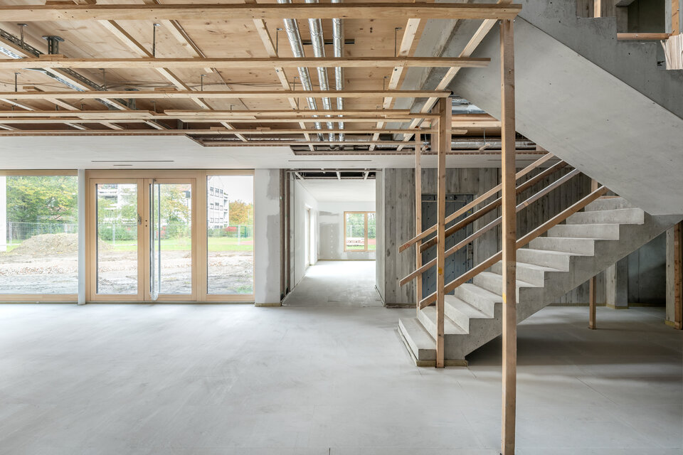 Auf die Schüttung aufbauend erfolgte die Verlegung der NORIT-TE 30 Therm GF – einer Fußbodenheizung mit geringer Aufbauhöhe und sehr guten Schallschutzeigenschaften. Mit niedrigen Vorlauftemperaturen unterstützt es den nachhaltigen Low-Tech-Ansatz des Gebäudes und sorgt zugleich für angenehmen, gleichmäßigen Wärmekomfort – ein wichtiger Aspekt für das tägliche Wohlbefinden von Kindern und Betreuungspersonal.