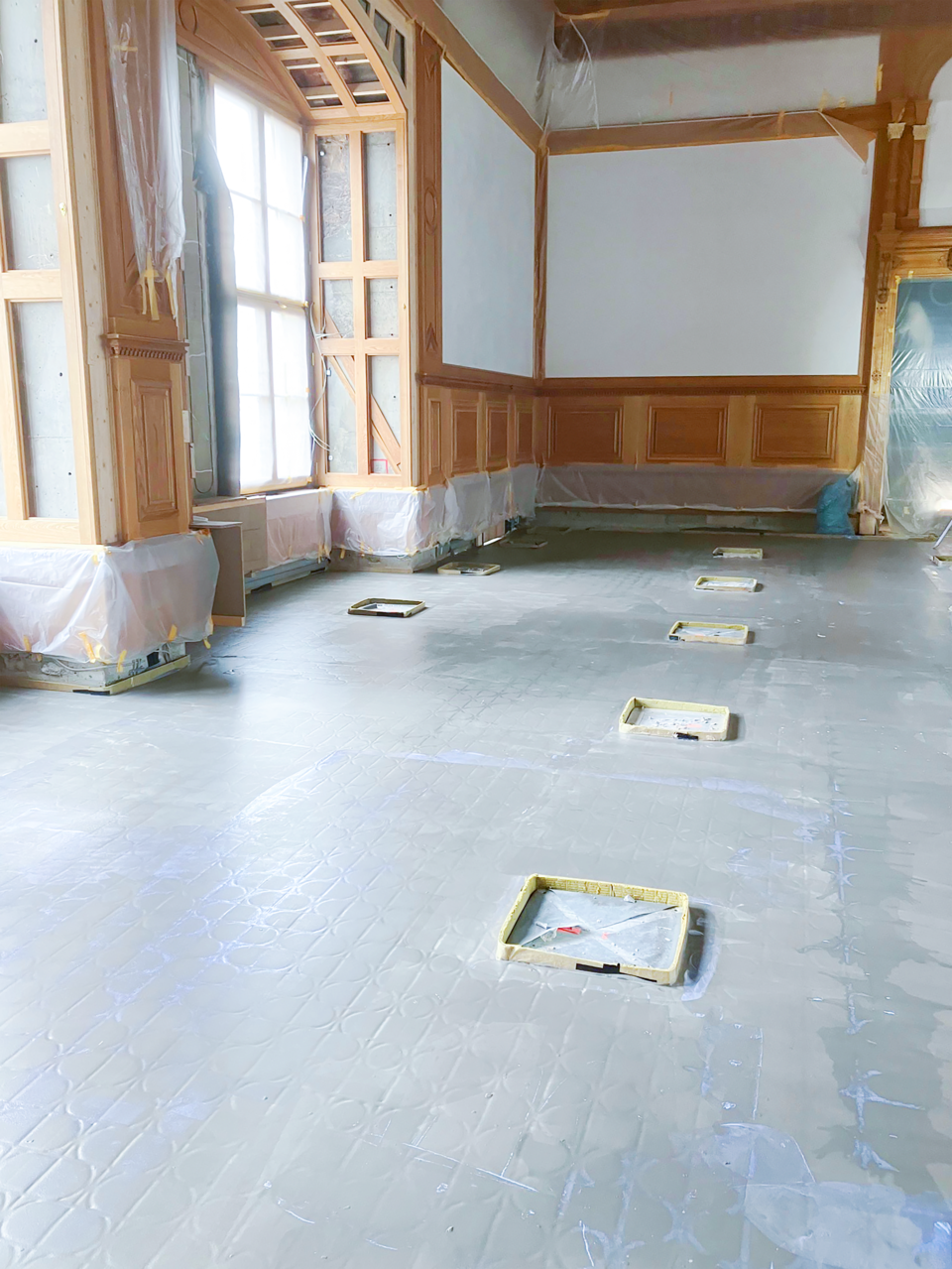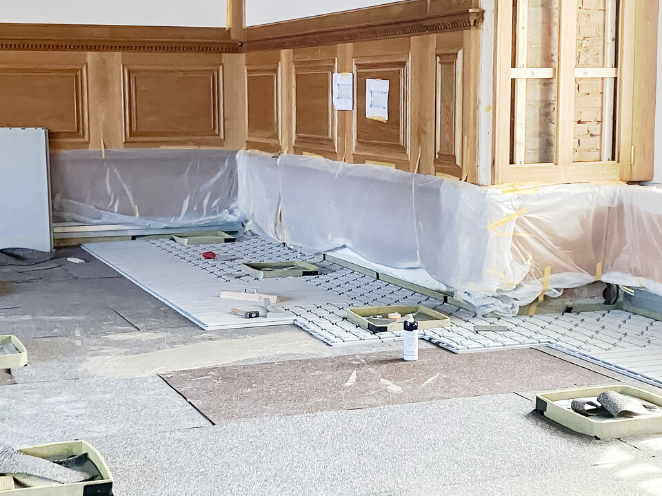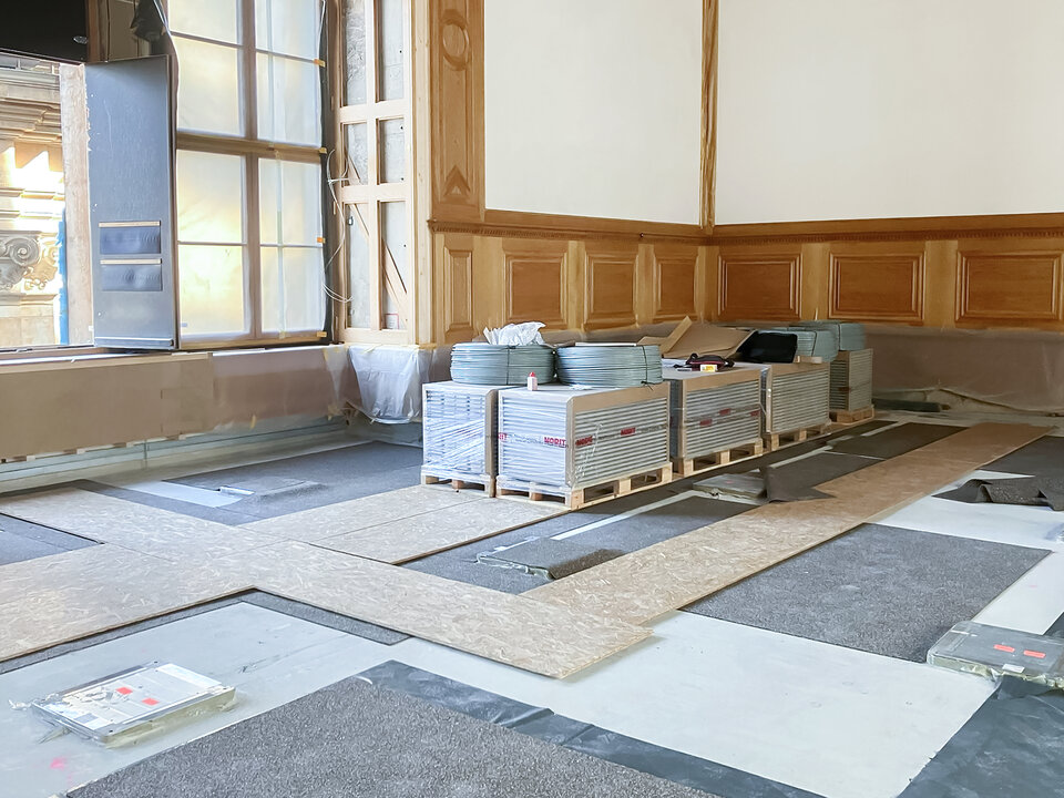 Mit einer Aufbauhöhe von nur 33 mm fügt sich das verwendete NORIT-TE 30 Therm GF Heizsystem in Kombination mit einem hochwertigen Oberbelag harmonisch in die ursprüngliche Ästhetik der Säle ein.