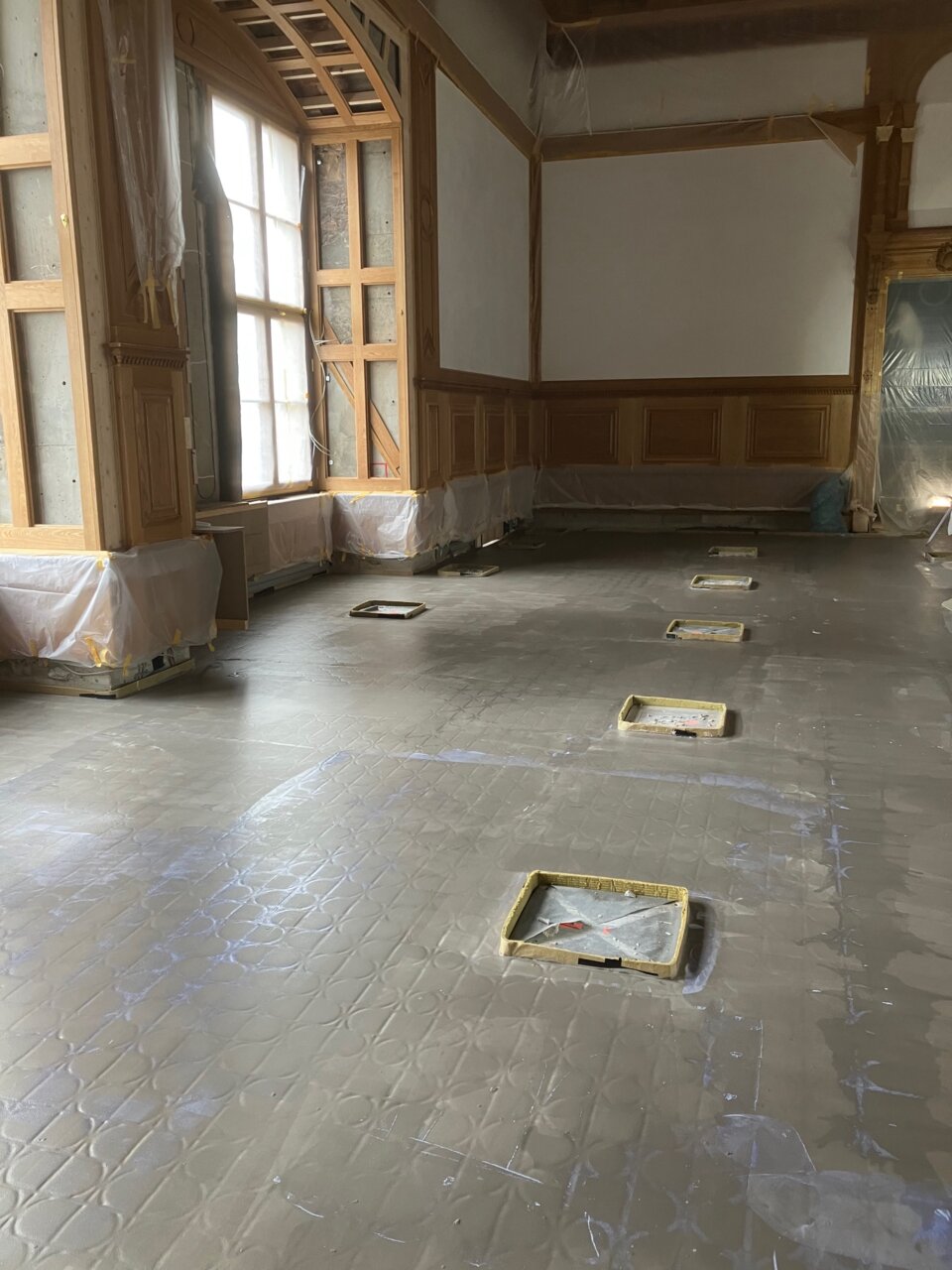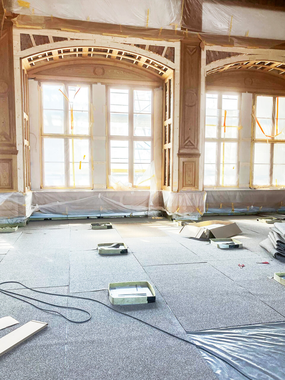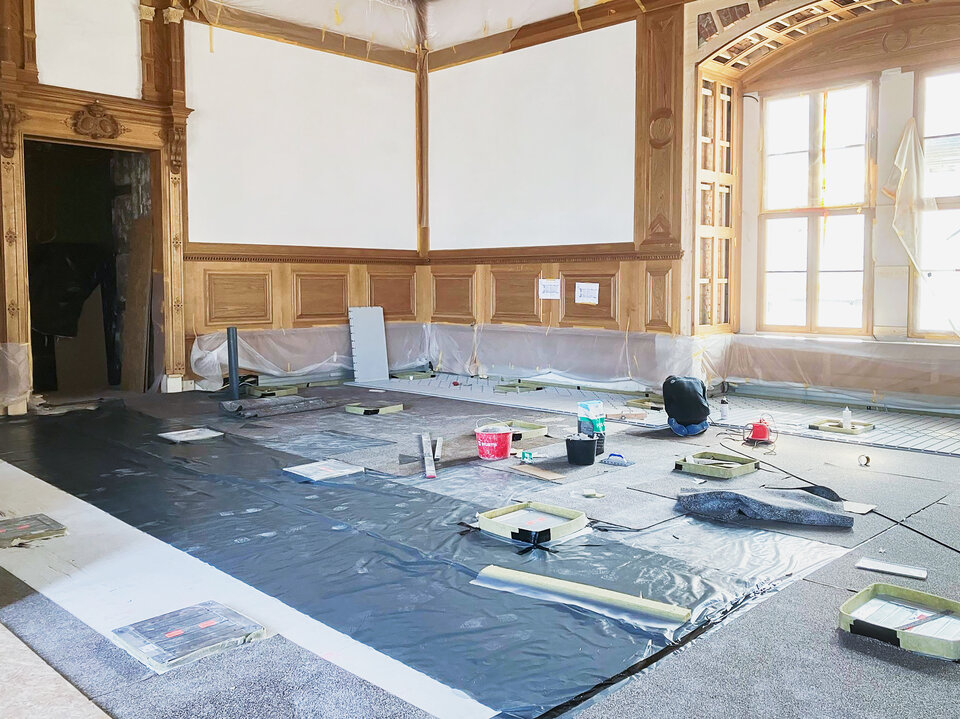 Ein wichtiger Meilenstein war die Verlegung der NORIT-TE 30 Therm GF Fußbodenheizung im Propositionssaal und Großen Ballsaal durch den beauftragten Verleger. Insgesamt wurden rund 700 m² Heizfläche verlegt und vergossen – die Grundlage für die nachfolgenden Belagsarbeiten.