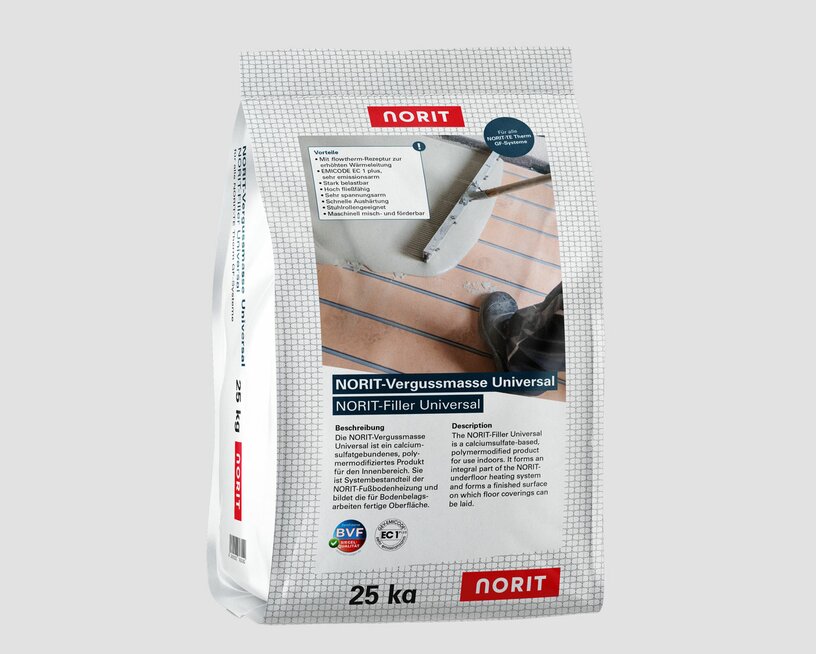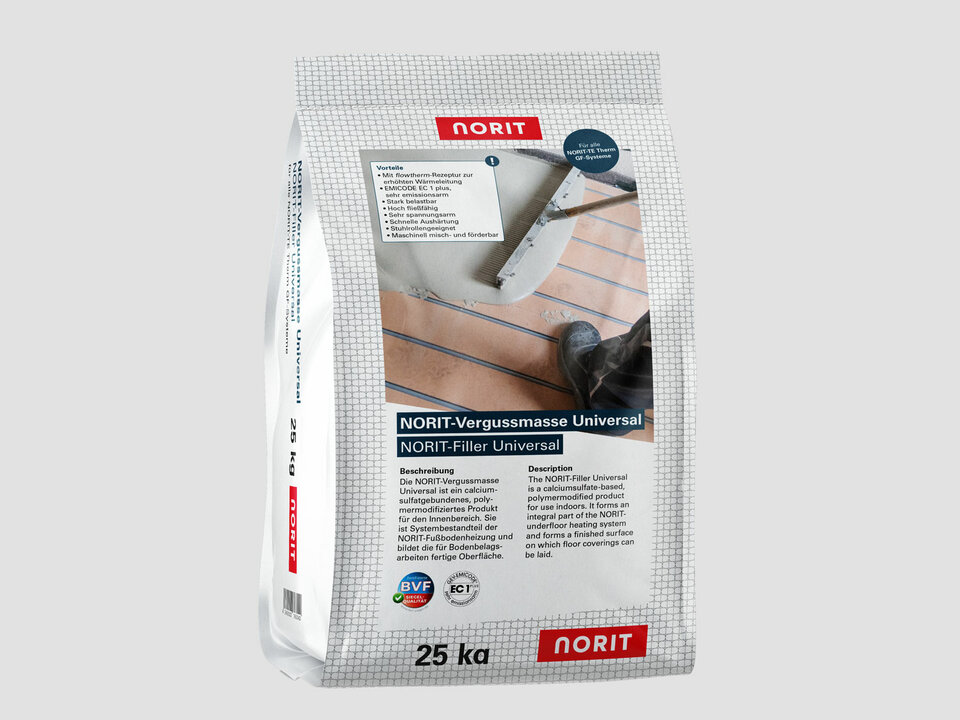 We are pleased to present our new NORIT-Filler Universal, which will replace the previous NORIT-Filler starting mid-May. This innovative calcium sulphate-based filler offers a range of benefits that will optimise your work processes and drive your projects forward successfully. The new casting compound is calcium sulphate-based and impresses with its improved flow behaviour, which makes it much easier to work with. In addition, this new product makes your ground ready for laying very quickly. You can start laying surface coverings after just 4 days, without the need for CM measurement. This allows you to continue your projects more quickly. The NORIT-Filler Universal can also be used on all NORIT-TE Therm GF underfloor heating systems and enables a smooth workflow.