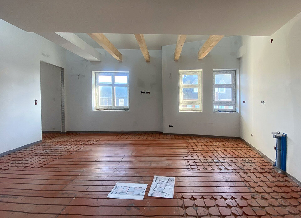 On the upper floor, the NORIT-TE 20 dry screed made of gypsum fibre with a unique click system was installed. This system allows for especially fast, precise and secure installation without additional screwing or long drying times, making it ideal for the demanding conditions of existing ceilings. The resulting screed surface also provides a stable, load-distributing base for all types of floor finishes while meeting high standards of building biology.