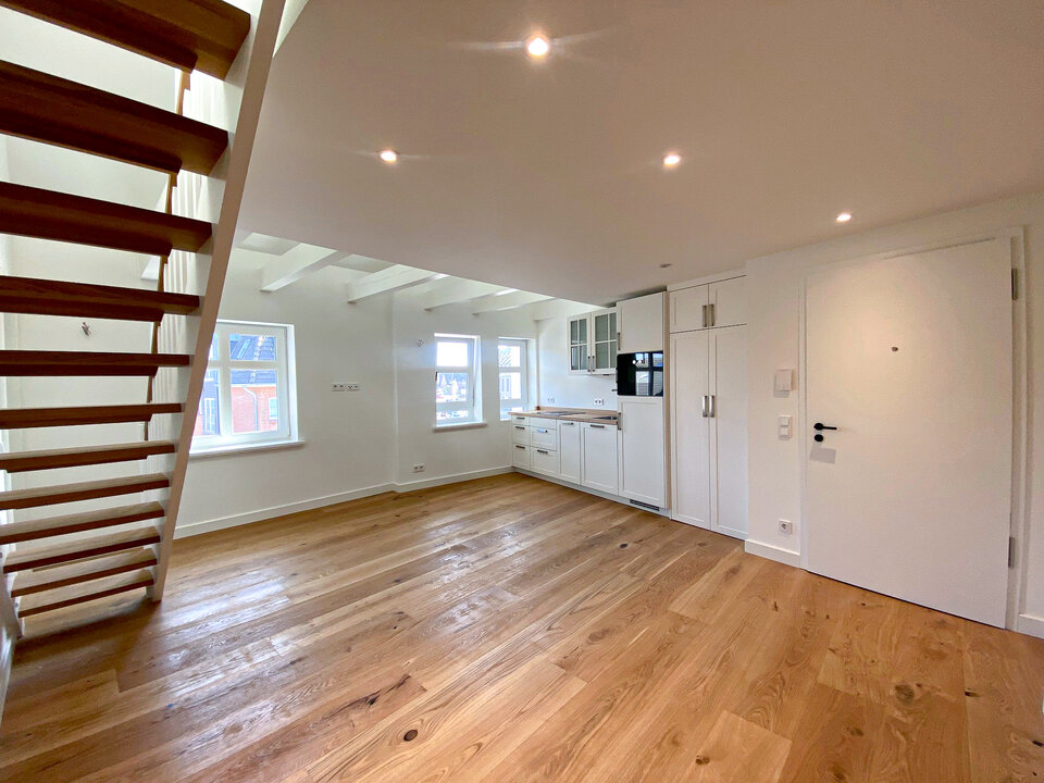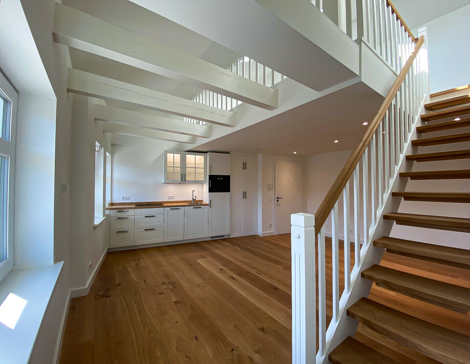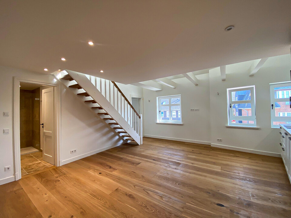 As part of the refurbishment of several residential complexes in Westerland on the island of Sylt, exclusive apartments were created that combine modern comfort with a distinctly Nordic design. The partially two-storey holiday apartments feature a clean white aesthetic, complemented by light timber elements, exposed beam ceilings and high-quality wooden flooring. This combination of materials creates a warm, welcoming atmosphere and highlights the project’s high design standards.